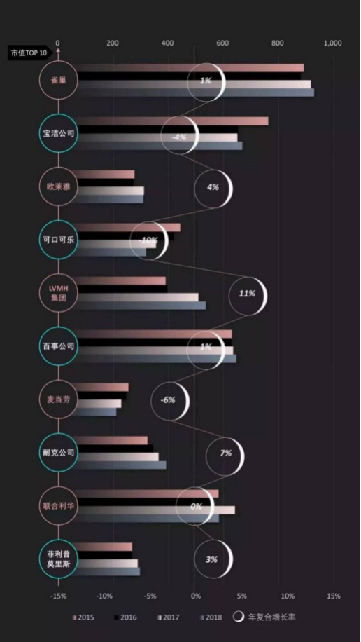 过去五年,是全球传统消费品牌增长停滞的五年,也是全球新晋品牌价值增长最快的五年,这段时间内,全球市值排名TOP 10的消费品公司的复合增长率只有0.4%,就连宝洁、可口可乐和麦当劳这样的公司都出现业绩大跳水的现象。