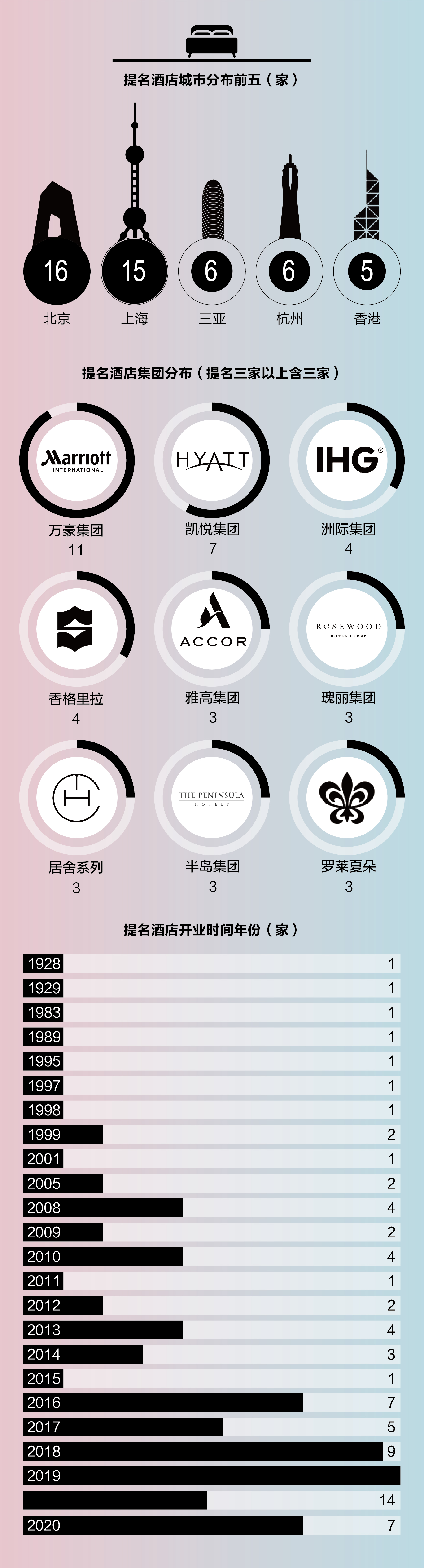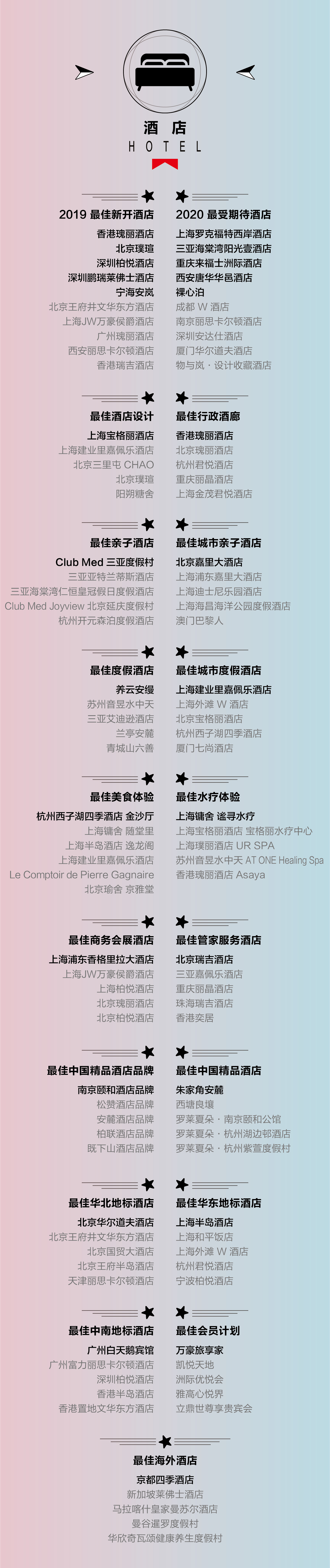 这次是向往指南的第二次发榜,对于榜单的体量也做了部分的调整。榜单覆盖酒店、航空及邮轮三大领域:酒店方面设立有 19 类奖项,总共 105 个提名中有 27 家获奖品牌与酒店;航空方面设立有 8 类奖项,总共 24 个提名中有 8 个获奖品牌与航司;邮轮方面设立有 6 类奖项,有 6 家品牌与邮轮公司获奖。