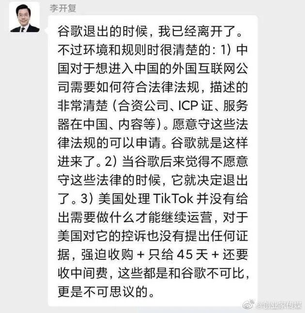 他表示,谷歌退出中国时,他已经离开谷歌,但中国对于想进入中国的外国互联网公司需要如何符合法律法规,描述得非常清楚。而美国处理TikTok并没有给出需要做什么,才能继续运营。对于美国对TikTo的控诉也没有提出任何证据,强迫收购+只给45天+还要收中间费,这些都是和谷歌不可比,更是不可思议的。
