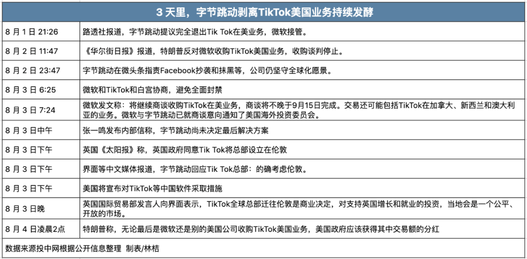 “就这几个美国互联网巨头来说,卖给微软是最合理的、大家都会接受的:从Skype到linkedIn,微软在社交产品一直有想法,但是没做好,大概率微软会让TikTok独立运营。”