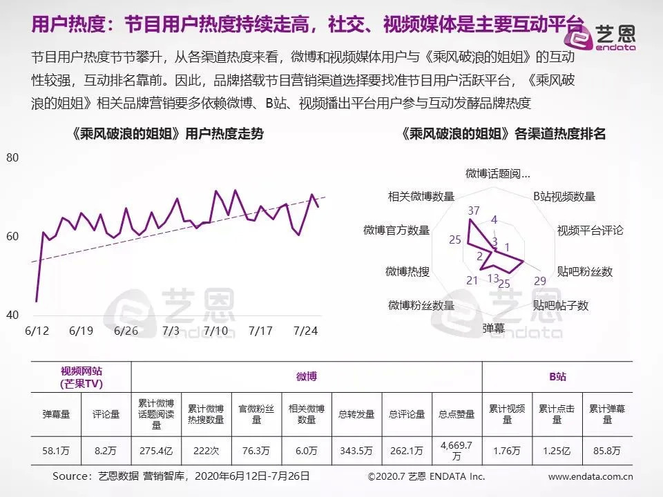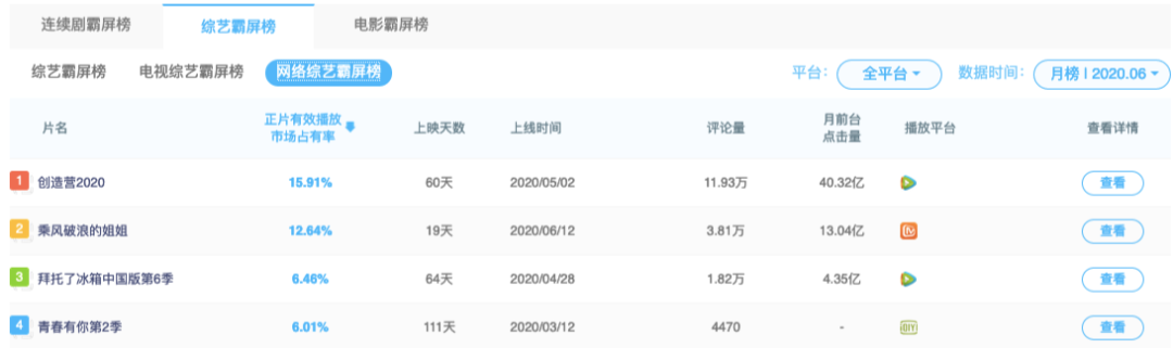 在艺恩数据上,《乘风破浪的姐姐》自上线起,一直占据播映指数排行榜周榜第一的位置;在骨朵热度指数排行榜上,《乘风破浪的姐姐》自第26周(6月22日—6月28日)起,连续在周榜排名第一;在云合数据上,6月网综有效播放量上线19天的《乘风破浪的姐姐》仅次于《创造营2020》排在第二位。