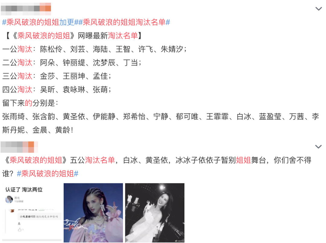 这也与节目录制与播出巨大的时差有关。节目还没上线,网上关于一公淘汰名单的爆料已经出现;7月15日,7位复活名单已经产生,而当时,节目刚刚播完二公舞台,节目中确定淘汰的姐姐只有10位。