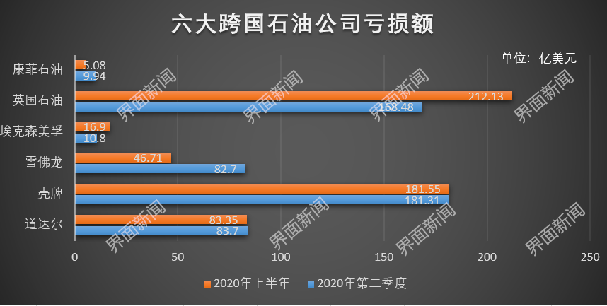 据界面新闻统计,这六大跨国石油公司二季度亏损总额达536.93亿美元(约合人民币3748亿元),上半年总亏损为545.72亿美元(约合人民币3809.72亿)。