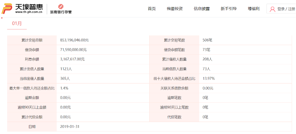 天壕普惠官网披露的运营数据截至2019年1月,数据显示其累计交易总额为8.53亿元,借贷余额7159万元,逾期金额及累计代偿金额均为0。