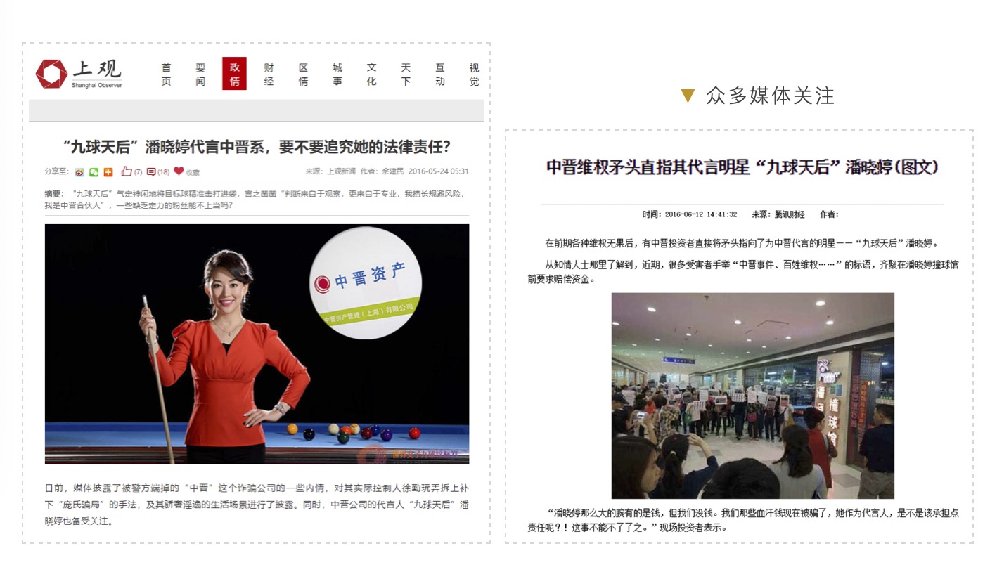 2016年4月,“中晋系”投资理财产品爆雷,被套牢的投资者达上万人。案发后,不少投资人自称是看了潘晓婷的代言广告才进行了投资,更有一些投资人齐聚在潘晓婷撞球馆前要求赔偿。一时间,维权矛头直指其代言明星潘晓婷。