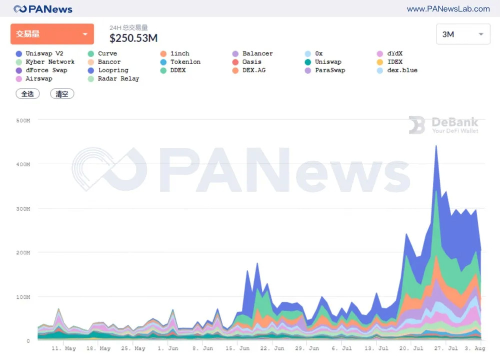 6月份,去中心化交易所(DEX)的成交量只是在中旬迎来了一个小高峰,之后成交量下降。7月,DEX终于迎来了全面爆发,日成交量增长510%。DEX中的龙头Uniswap V2的交易量占据了DEX总量的43.9%。7月份,Uniswap V2的日交易量在数量上上升1.16亿美元,增长835%。