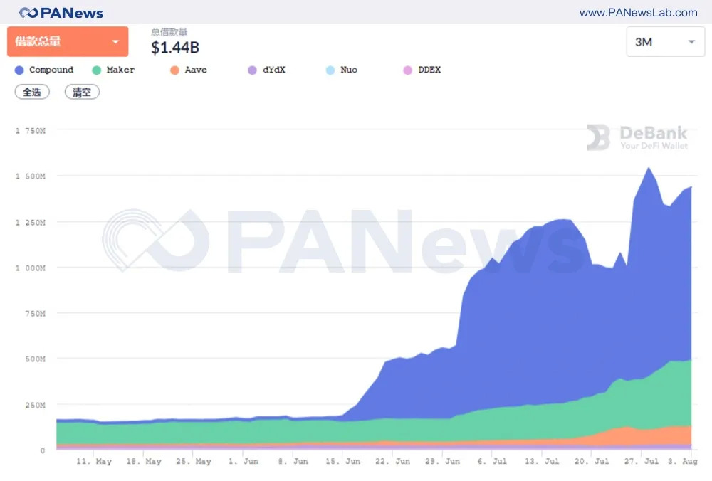 Compound中借贷量的增长并没有引起投资者的热情,在这一个月里,其治理代币COMP的价格接近腰斩,创下新低。在上一个月的DeFi月报中PANews也提到COMP可能存在泡沫,前期流通量的不足可能过高的推升了COMP的价格。并且,借贷市场的借款或存款并没能完全反应产品的使用情况。为了获取平台的治理代币,同一个人可能对同一币种进行反复存款、贷款。以DAI为例,目前DAI的总供应量只有3.8亿,而Compound中DAI的存款就有10.6亿,这意味着有相当多的DAI被用于在Compound中反复的存款、贷款。
