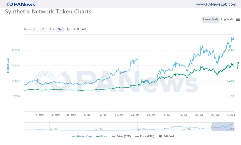 7月份以前,Synthetix的原生代币SNX的最高价格在2美元附近,而现在已经涨到了4美元。SNX的价格上涨能够推动合成资产规模的增加。除了原本的合成资产之间的交易外,现在Synthetix还提供借贷和期权交易服务。