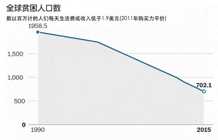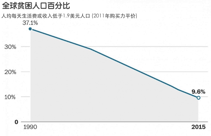 25年前,世界上有超过三分之一的人口生活在国际贫困线以下。在2012年,贫困人口的比例缩小到低于13%。现在,根据世界银行的报告,按照新的国际贫困线:每人每天生活费或收入不到1.9美元(约合12.3元人民币)计算,全世界贫困人口的比例已下降到9.6%。