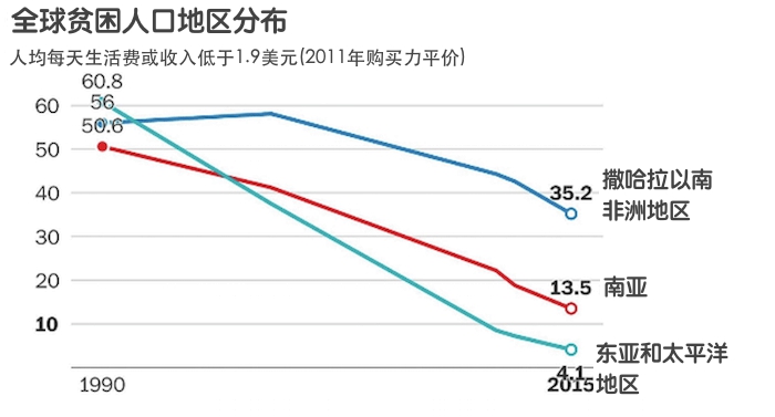 数据显示,东亚和太平洋地区的脱贫速度最快。1990年这些地区有60%多一点的人口生活在贫穷中,而今天这一比例估计仅为4.1%。南亚地区也有显著进步,贫穷人口从51%下降到了13.5%。撒哈拉以南的非洲仍然是贫困现象最为严重的地区。在那里,35.2%的人口每天生活费不足1.9美元。