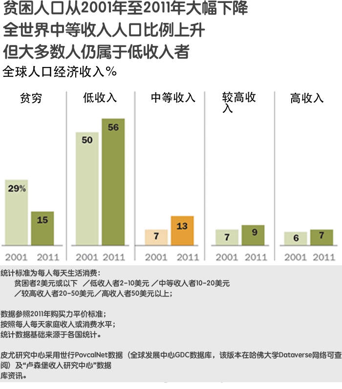 与全球人口迅速脱贫对应的是,中产阶级在逐渐崛起。皮尤研究中心的一项研究指出,从2001年至今,全球可被划为中产阶级的人口翻了一倍,大约占总人口的13%。然而,这样的繁荣主要出现在拉丁美洲、中国、以及东欧地区。全世界的大部分人仍属于低收入者。