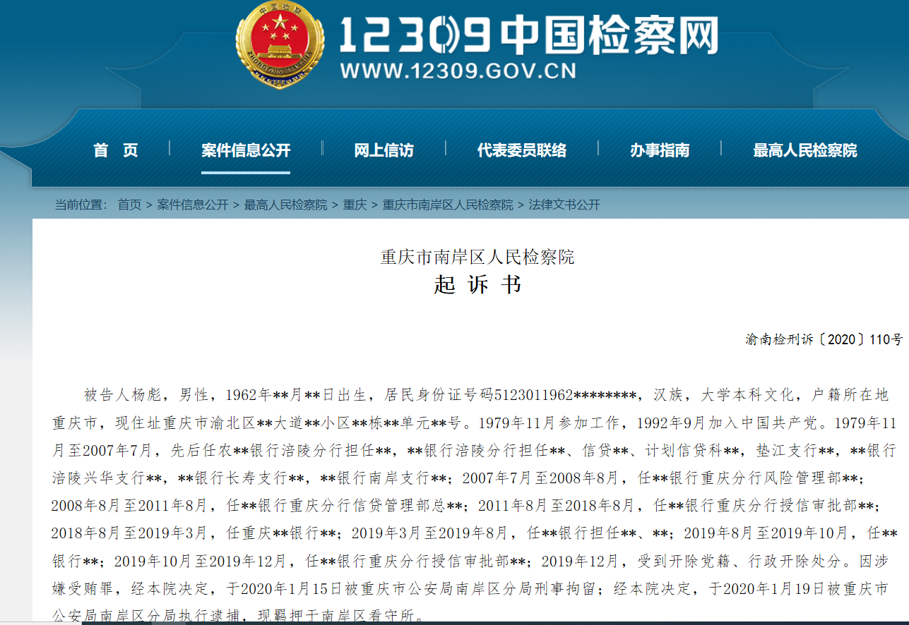 据重庆市南岸区人民检察院公布的起诉书显示,杨彪就职于中国某银行重庆分行信贷管理部、授信审批部某审贷会某期间,利用其职务便利,涉嫌非法收受他人贿赂120余次,受贿金额500多万,在火锅馆、小区门口、病房、家中、会所、殡仪馆、办公室等多个场所受贿,受贿方式包括现金、购物卡、加油卡赠送和假借钱收高利等,收贿对象涉及投资、房产企业的董事长、总经理和财务总监等多名人员。