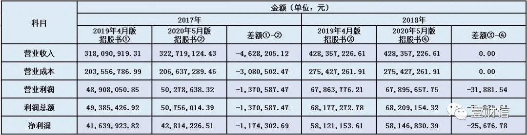 从上图中看,负债科目2018年的数据异常变动引人注目。根据两版招股书的合并资产负债表,2018年的负债科目下仅预计负债的数据做了变更,这引起了非流动负债和负债合计的调整。在合并资产负债表中,第一版招股书披露的2018年预计负债为4,408,686.38元,第二版招股书披露的2018年预计负债为4,440,572.27元,两者相差31,885.89元,但是非资产负债和负债合计的数据均相差8,114.11元。