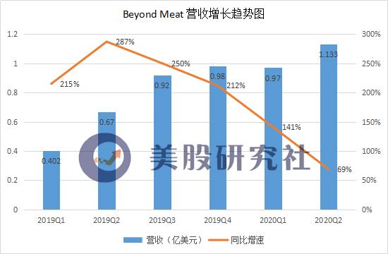 财报显示,二季度Beyond Meat的营收同比增长69%,单看这一季度的增速依然值得肯定,何况还实现了对1亿美元营收关卡的突破,但若与前几个季度的增速相比却在明显放缓。