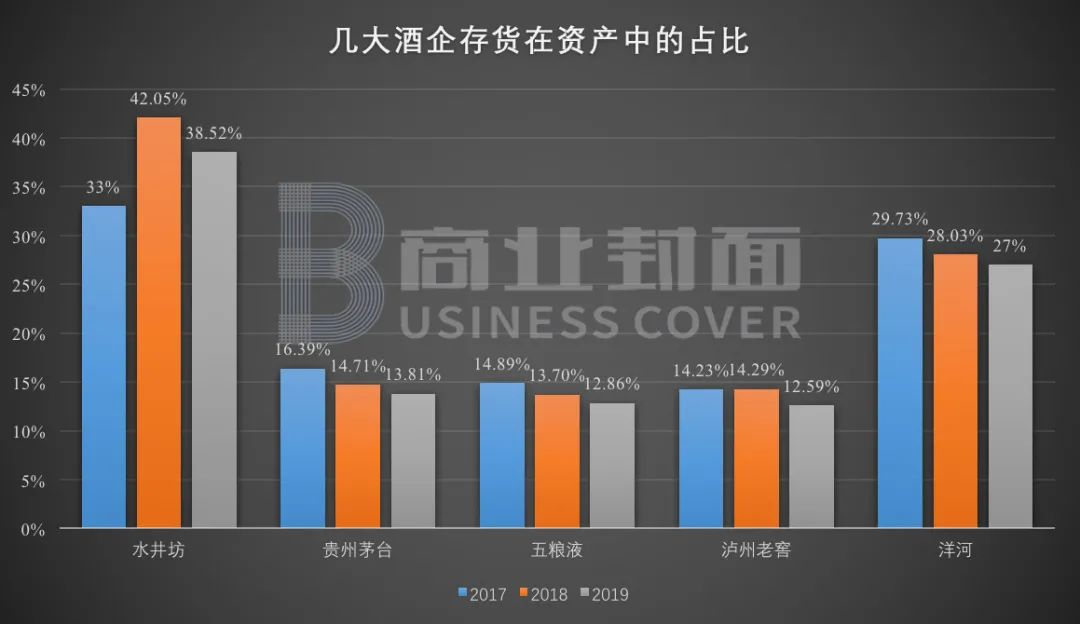 而水井坊的存货也确是位居高位。数据显示,2017-2019年,水井坊存货在总资产中的占比分别为33%、42.05%、38.52%。明显高于同期贵州茅台、五粮液、泸州老窖和洋河。