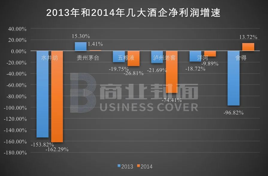 数据显示,2013年、2014年间水井坊净利润增长分别为-153.82%和-162.29%,而与水井坊体量相当的另一大川酒企业舍得同期净利润变动为-96.82%、13.72%;