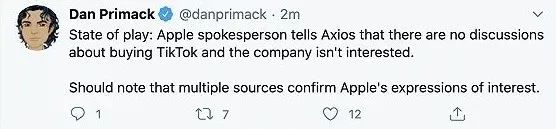 8月4日晚,外媒称苹果对收购TikTok表示极大兴趣,随后Axios网站编辑在推特上澄清称,“苹果发言人表示,目前该公司没有讨论收购TikTok,对此也不感兴趣。”