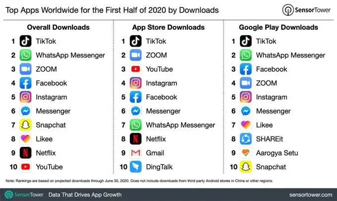 而从2020年1月开始,TikTok就打败了国外的WhatsApp、Facebook、Youtube和Instagram这四大巨头,全球下载量排名跃居第一。