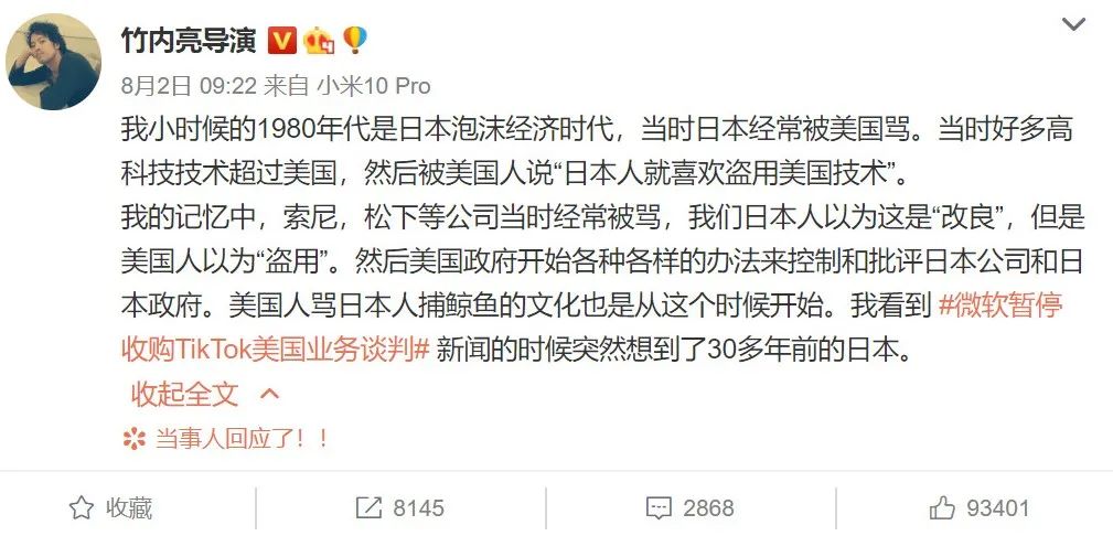 家住南京的日本籍纪录片导演竹内亮发微博感慨道:“我的记忆中,索尼,松下等公司当时经常被骂,我们日本人以为这是‘改良’,但是美国人以为‘盗用’。然后美国政府开始各种各样的办法来控制和批评日本公司和日本政府。我看到微软暂停收购TikTok美国业务谈判新闻的时候,突然想到了30多年前的日本。”