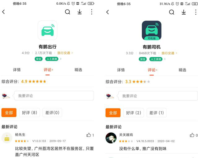 “有鹏出行”和“有鹏司机”的现状与“即客行”高度相似。在某安卓大厂的应用商店中,前者的下载量不足三万,后者则仅有8千多,评价也都不高。