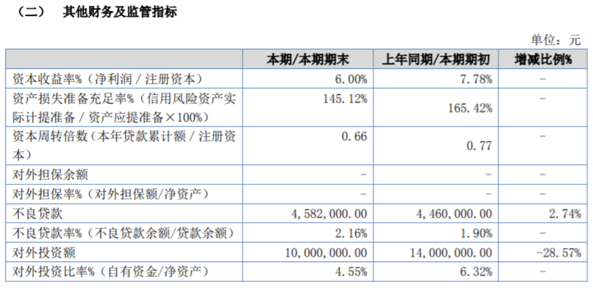 其他财务及监管指标显示,截至6月30日,信源小贷资本收益率6%,资产损失准备充足率145.12%,不良贷款率2.16%。财报称,报告期内其不良贷款余额458.20万元,不良贷款率较期初增加 0.02%。信源小贷认为其不良贷款率仍保持在较低水平,且已足额计提贷款损失准备和一般风险准备。