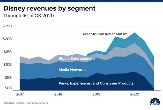 情况与第二财季类似,以迪士尼电视频道、电视网为主要的媒体网络业务和包括流媒体平台的消费者和国际业务,受疫情间线上流量爆发出现增长或小幅下滑,但一直以来的营收主力主题乐园、周边衍生等则因为运营停摆而出现下滑,电影业务更因为影院无法正常营业而进程缓慢。