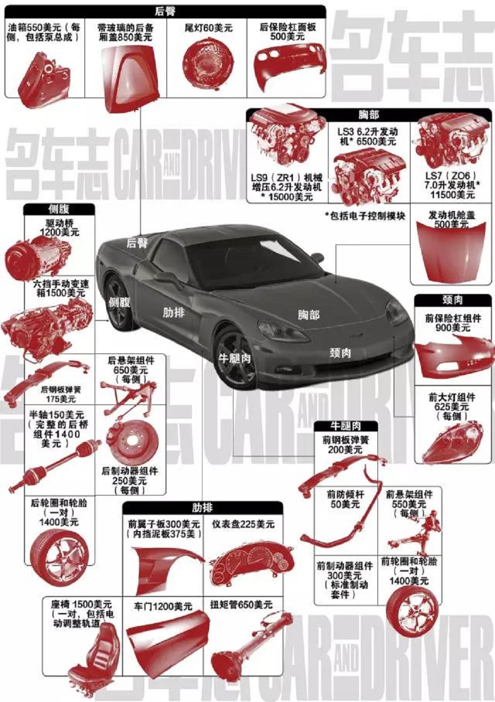来自迪诺科尔维特跑车回收及销售公司的迪诺·贝勒告诉我们,如果他能够以通用公司零售新部件一半的价格卖掉一辆报废跑车的所有部件,那车身部件的价格将比一辆车的建议零售价还要高。