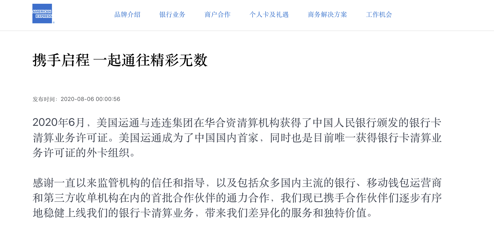 8月6日凌晨,美国运通公司通过官方网站正式宣布,历经近两年的筹备,由连通(杭州)技术服务有限公司运营的银行卡清算系统正式上线。
