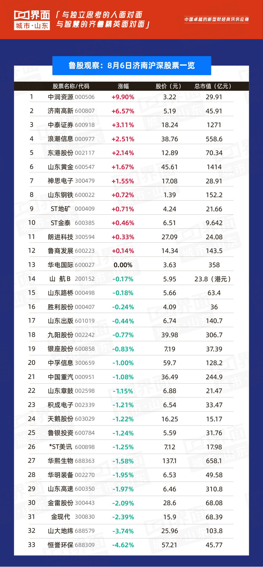 8月6日,山东省内沪深股票有136只个股下跌,74只上涨;总市值过千亿的有万华化学(600309)、中泰证券(600918)、海尔智家(600690)、山东黄金(600547)、潍柴动力(000338)、歌尔股份(002241)、青岛啤酒(600600)共7家,500亿-1000亿的共有3家,分别是中航沈飞(600760)、华熙生物(688363)、浪潮信息(000977)。
