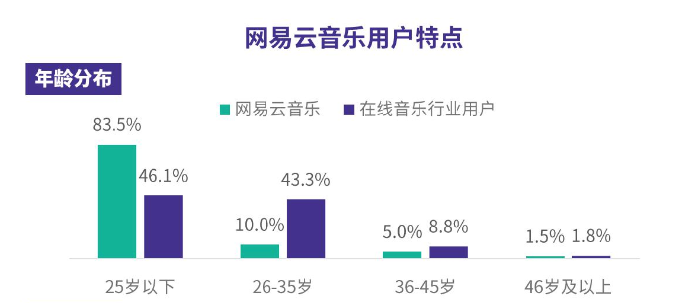从极光大数据的相关报告数据来看,网易云音乐的用户群体明显更偏于年轻化,其中25岁以下的年轻用户占比高达83.5%,几乎是整个在线音乐行业平均值(46.1%)的两倍。年轻人自然有着鲜明的性格特点:追求个性化、有很强的表达欲望。