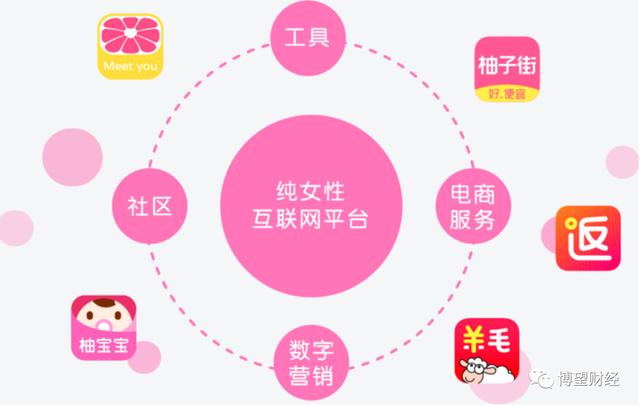 目前旗下的APP有美柚、柚宝宝、柚子街、羊毛省钱、返还网。功能分别是涵盖女性经期及孕期管理、资讯阅览、知识科普、社区交流、线上购物等。