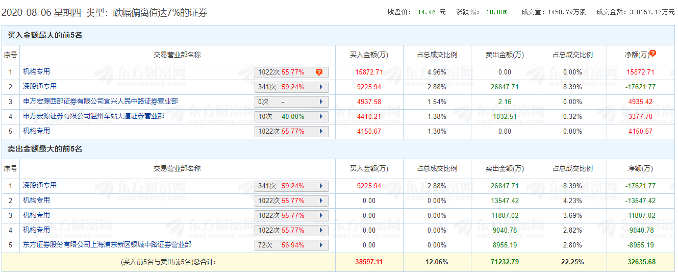 龙虎榜数据显示,8月6日,康泰生物被净卖出3.26亿元。买入方面,买一、买五席位均为机构席位,净买入2亿元,深股通居买二席位,净卖出1.76亿元;卖出方面,卖二到卖四均为机构席位,净卖出3.44亿元。