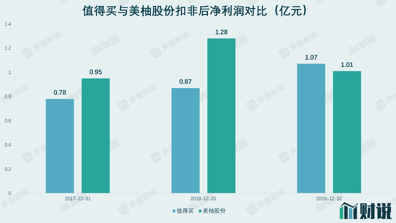 扣非净利润方面也是如此。2017年,值得买和美柚股份扣非后净利润分别为7798万元和9473万元。2019年,值得买扣非后净利润达到1.07亿元,同样反超美柚股份。