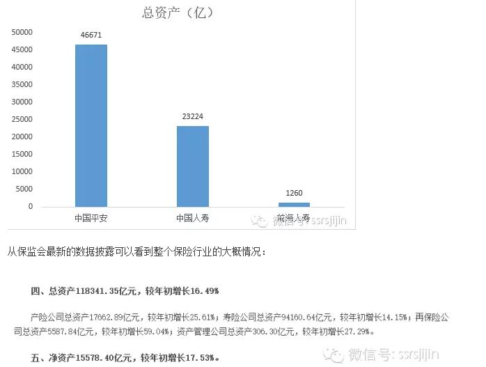 不过,因为保险公司的业务特性,这个规模听起来吓人,但是在行业是很小的。对比一下中国平安、中国人寿就知道了。这里,中国平安的总资产有4.67万亿,是涵盖了平安银行的总资产的,粗略估算平安保险的资产规模也是2万亿级别。