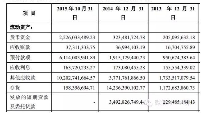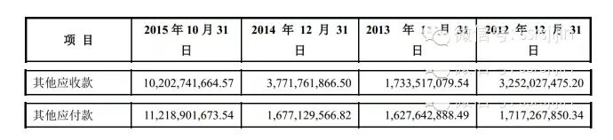 钜盛华除了找金融结构借钱,还找关联方借了不少钱。2015年10月末其他应付款飙升到112亿,增加了95亿。总的来看钜盛华找关联方或第三方融资了95亿,至于关联方或第三方怎会有能力给他提供31亿的现金呢?后面会提到这是靠抵押融资以及杠杆融资弄来的资金。