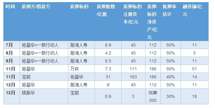 根据上表,以及目前金融市场对质押标的的融资比例,我们估算出钜盛华及一致行动一共融出了89亿元,宝能集团融出了14亿元,姚振华融出了18亿元,一共融出了121亿元。