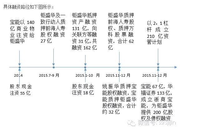 10月31日之后一共融出了94亿元,但是还没完,他准备在杠杆之上再加杠杆,怎么加杠杆呢?他选择了2015年11月11日成立深圳市浙商宝能产业投资合伙企业(有限合伙),该公司出资额是200亿,宝能集团出资67亿(94亿资金还剩27亿元),华福证券出资133亿(这笔钱不一定是华福证券自有资金)。2015年11-12月,浙商宝能可能通过股权和债权的方式将这200亿资金注入到钜盛华。