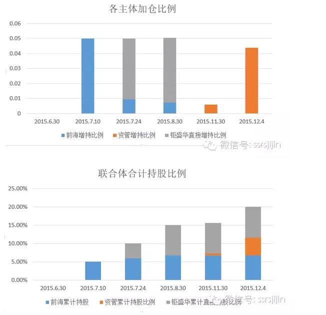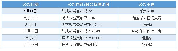 前海人寿和钜盛华自7月起通过二级市场买入万科股票,自7月11日前海人寿第一次举牌,钜盛华/前海联合体共发布简式权益变动书公告4次(含一次补充公告),详式权益变动书有关公告2次(含一次修订稿):