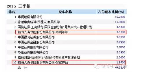 故考察万科三季报股东明细,即可大致看到前海人寿持有万科的最终状态(如下图)。前海是通过旗下保险产品买入的,进入前十大股东的两只产品合计持股6.14%,也就是说前海的持股主体都在这里了。