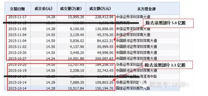 第二阶段, 2015年10-11月,钜盛华分两批交易,于2015年10月14日-20日大宗买回通过互换权益持有的万科约3.3亿股;10月27日-11月17日大宗买回通过收益互换持有的万科约5.6亿股。这两批次大宗交易占据了10月-11月万科A大宗交易的绝大部分: