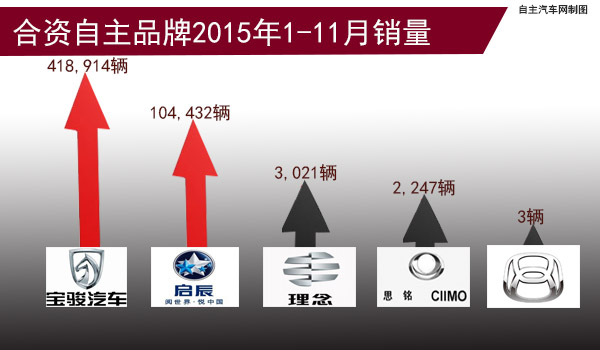 在市场表现上,宝骏和启辰业绩良好,年销量分别超过40万辆和10万辆,已达到规模化生产的标准。其中,上汽通用五菱的宝骏发展尤其令人瞩目,今年前11个月的销量为41.89万辆,同比增长高达189.6%,不仅成为合资自主品牌中的佼佼者,而且还超过了奇瑞、比亚迪等真正的自主品牌。
