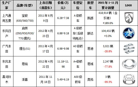 “传统合资自主品牌”目前已经实现上市销售的有五款:理念、启辰、宝骏、思铭、派喜,它们的上市时间集中在2011年下半年到2012年上半年,车型定位集中在A级及以下级别的轿车市场。