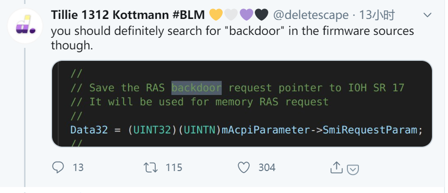 值得注意的是,Till Kottmann还在推特上提醒,在这些文件里的源代码中搜索“后门”字样时,会显示搜索结果,令人怀疑英特尔产品是否暗藏“后门”。不过英特尔对此回应称,在其产品政策中明文规定,该公司产品不得包含未说明的数据读写、曝露敏感设备信息的行为。