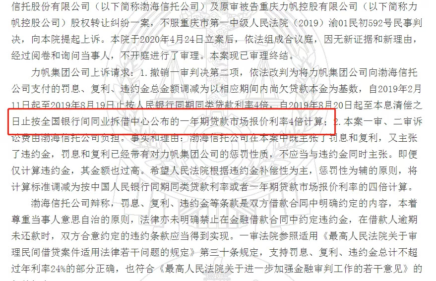 裁判文书网上的大量案例显示,法院支持的利率,是按全国银行间同业拆借中心公布的一年期贷款市场报价利率四倍来计算。