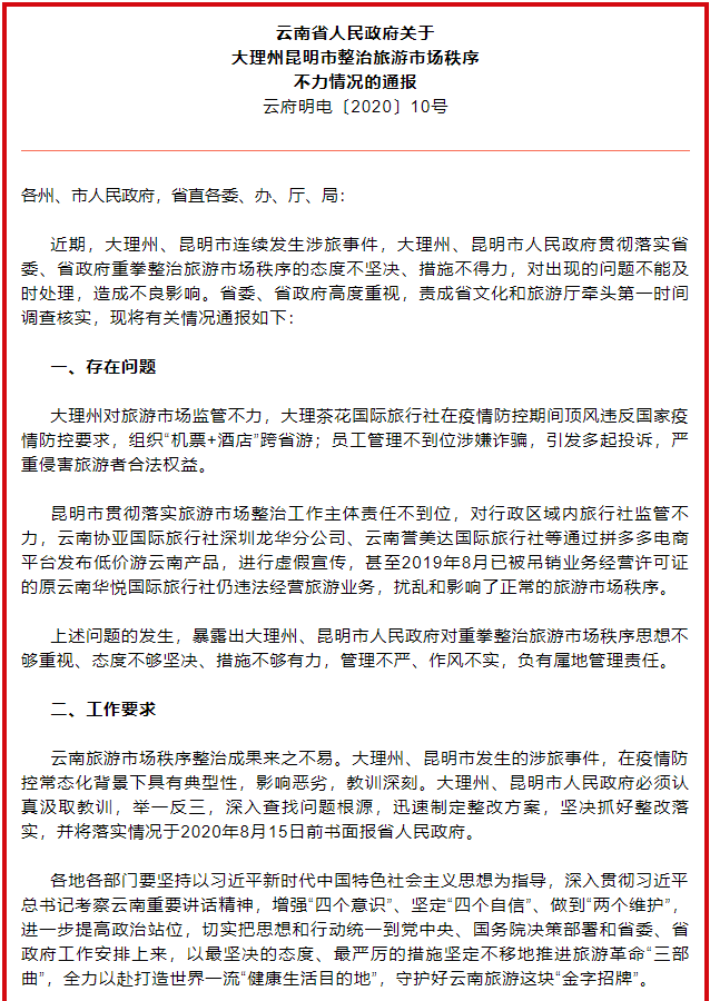 据云南省人民政府通报,近期,大理州、昆明市连续发生涉旅事件。其中大理州对旅游市场监管不力,大理茶花国际旅行社在疫情防控期间顶风违反国家疫情防控要求,组织“机票+酒店”跨省游;员工管理不到位涉嫌诈骗,引发多起投诉,严重侵害旅游者合法权益。