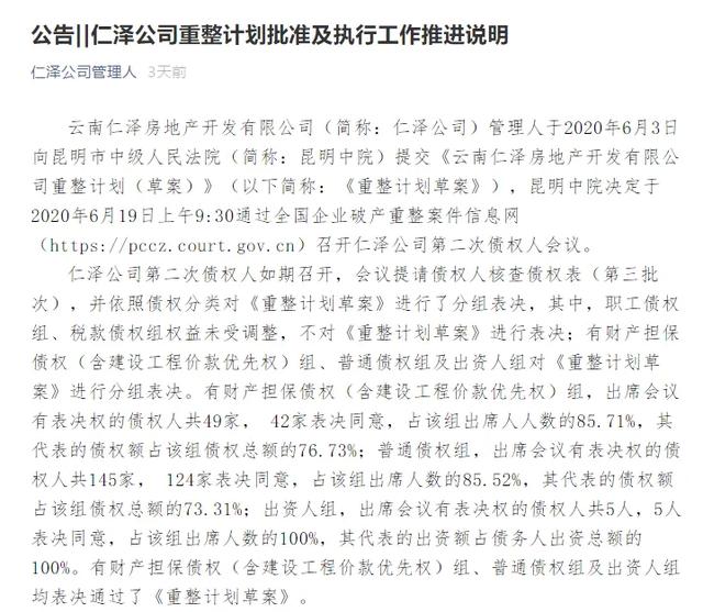 不过龙湖没有放弃,今年上半年仁泽地产破产重整第二次债权人会议,债权人成功达成《重整计划草案》。