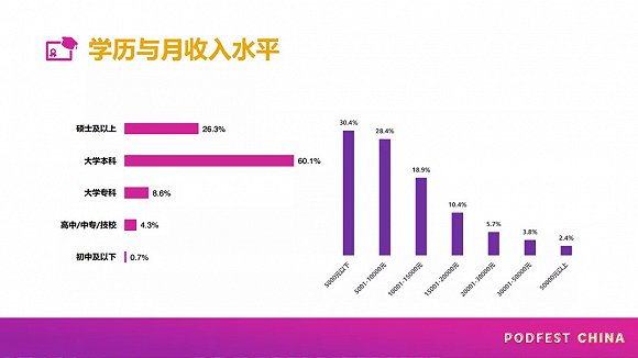 就中文播客本身的受众来说,听众对于播客商业化的接受度很高。PodFest China7月27日发布的《PodFest China 2020中文播客听众与消费调研》报告显示,87.8%的中文播客听众不反对播客商业化,88.5%的播客听众曾为内容付过费。收听播客的用户群体构成中,有86.4%的用户属于本科以上学历,月收入10000以上的人群达到41.2%,不论是付费意愿还是付费能力都处于较高水平。