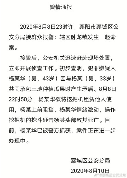 襄阳市公安局襄城区分局官方微博8月10日凌晨发布警情通报,2020年8月8日23时许,襄阳市襄城区公安分局接群众报警:辖区卧龙镇发生一起命案。