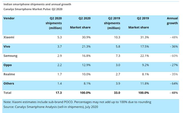 而小米在印度市场性价比玩法,已经被OV学习复制,尤其是vivo,从2019Q1的13.1%,在一年内迅速上涨至2020Q1的21%。
