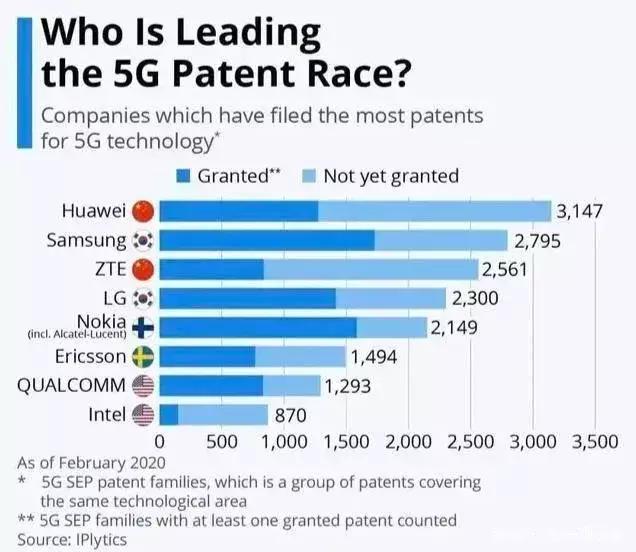 从数据来看,在5G技术专利上,华为凭借3147件5G标准必要专利数量位居全球榜首。